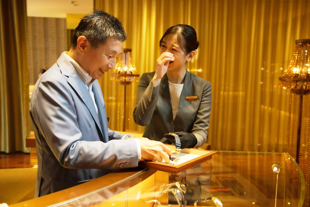 男性が時計を試しています。 - The staff is smiling next to him.