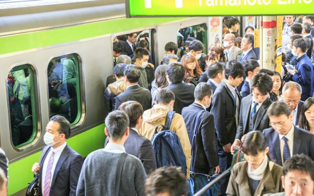 ホームはとても混んでいます。 - Some people are wearing masks.